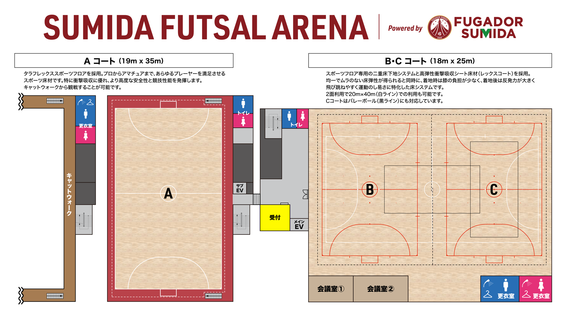 床材には、高品質なタラフレックススポーツフロアを採用しており、競技志向からエンジョイ層まで様々なフットサルスタイルに対応しています。