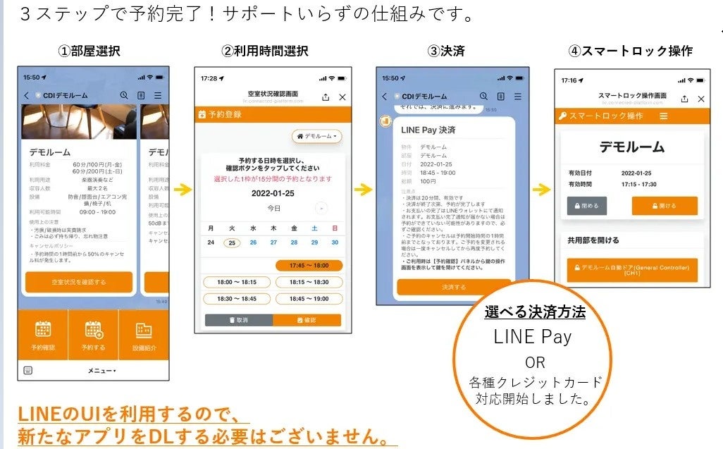 「Connected Space Share(コネクティッド・スペース・シェア)」は、コミュニケーションアプリ「LINE」 [*5] および個人・法人向けアカウントサービス「LINE公式アカウント」をユーザーインターフェースとしたスペースの予約・決済システムです。 ユーザーは、レンタルしたいスペースのLINE公式アカウントを友だち追加することで、スペースの予約からスマートロックの解錠、支払処理までシームレスに行うことができます。