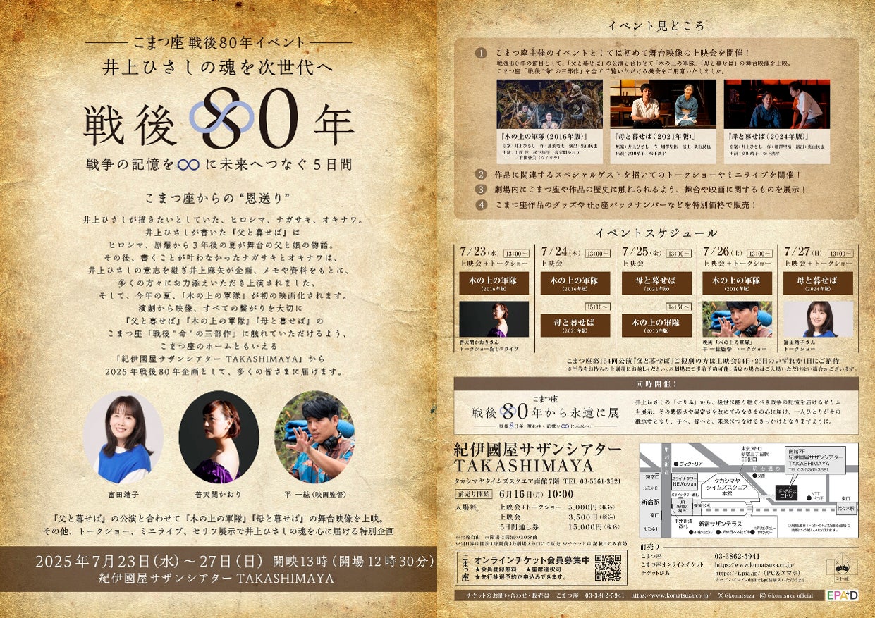 こまつ座戦後80年イベント 「井上ひさしの魂を次世代へ~戦後80年 戦争の記憶を∞に未来へつなぐ5日間」開催のお知らせ
