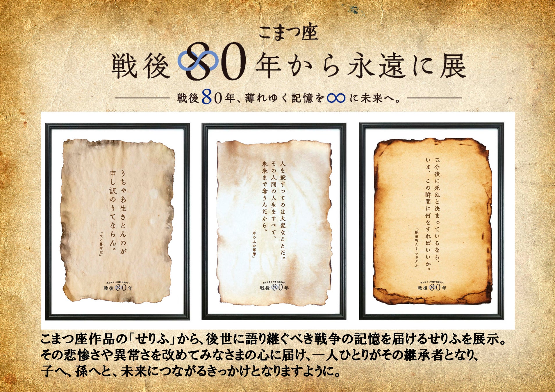 こまつ座作品の「せりふ」から、後世に語り継ぐべき戦争の記憶を展示。その悲惨さや異常さを改めてみなさまの心に届け、一人ひとりがその継承者となり、子へ、孫へと、未来につながるきっかけとなりますように。