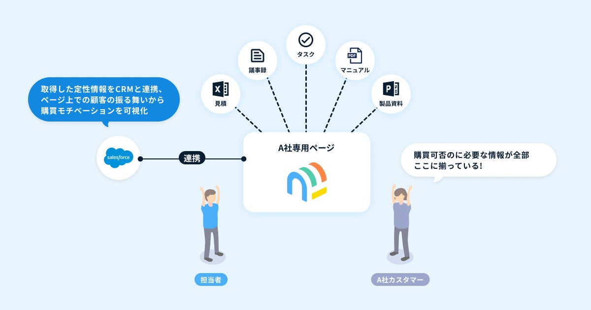 ページ上での顧客の振る舞いから購買モチベーションを可視化したり、取得した定性情報をCRM(※)と連携も可能です。売り手企業の受注率やリードタイム短縮、LTV最大化に寄与し、買い手企業にとってのIT製品を通じたROI最大化に貢献します。