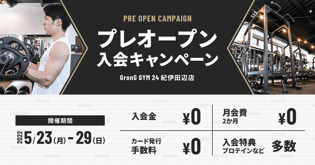 GronG GYM 24 紀伊田辺店のオープンを記念して、プレオープン期間限定の「プレオープン入会キャンペーン」を開催します!