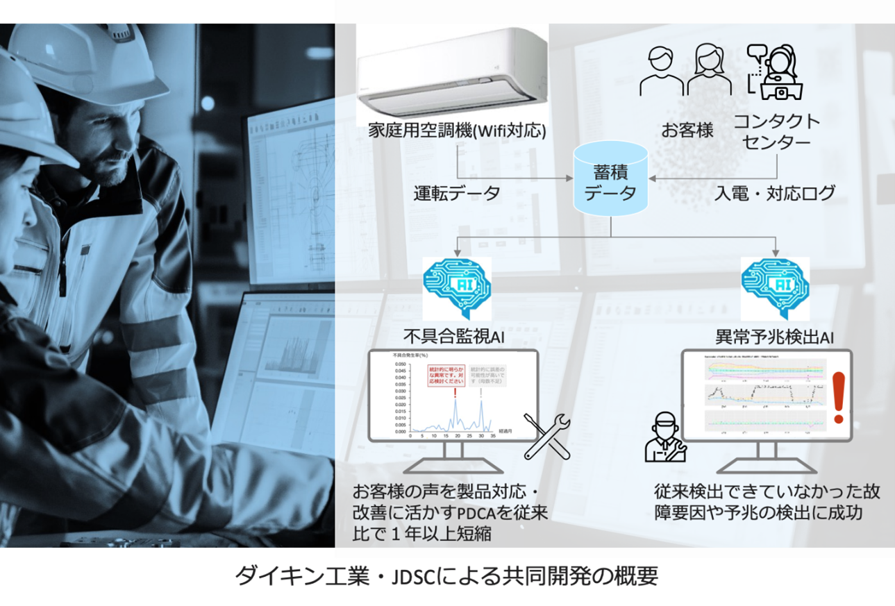 ダイキン工業株式会社(本社:大阪府大阪市、代表取締役社長 兼 CEO:十河政則、以下「ダイキン工業」)と株式会社JDSC(本社:東京都文京区、代表取締役:加藤エルテス聡志、以下「JDSC」)は、空調機の不具合監視・運転異常予兆検出を可能にするAIを共同開発し、このたび試験運用を通じて業務効率化や製品対応・改善のPDCAサイクル高速化の効果を確認しました。今後、業務への本格適用とさらなる高度化を目指します。