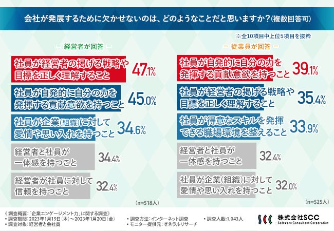 経営者と従業員を対象に、「会社が発展するために欠かせないのは、どのようなことだと思いますか?(複数回答可)」と質問したところ、それぞれ下記のような回答結果になりました。