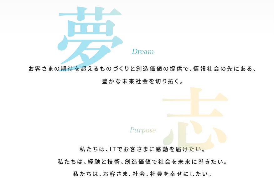 | 「夢」 お客さまの期待を超えるものづくりと創造価値の提供で、 情報社会の先にある、豊かな未来社会を切り拓く。 「志」 私たちは、ITでお客さまに感動を届けたい。 私たちは、経験と技術、創造価値で社会を未来に導きたい。 私たちは、お客さま、社会、社員を幸せにしたい。 |