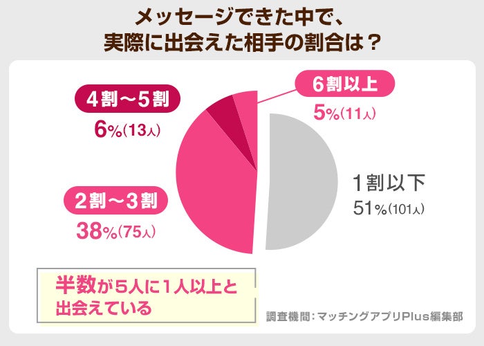 メッセージから出会いに繋がる割合のアンケートでは、約半数が2割以上の確率で出会えている事がわかりました。