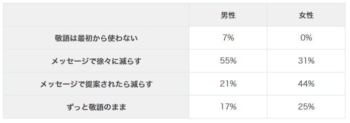 男女別で比較してみると、男性の方が敬語を使わなくなるタイミングが早く、距離の詰め方が早い事がわかりました。