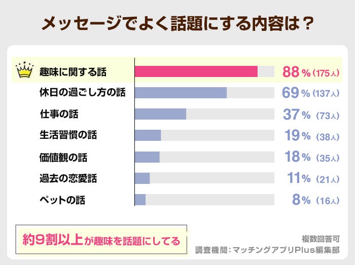 メッセージの話題は、趣味に関する話が圧倒的でした。次点で休日の過ごし方の話も多く、約7割の人が話題にしていました。