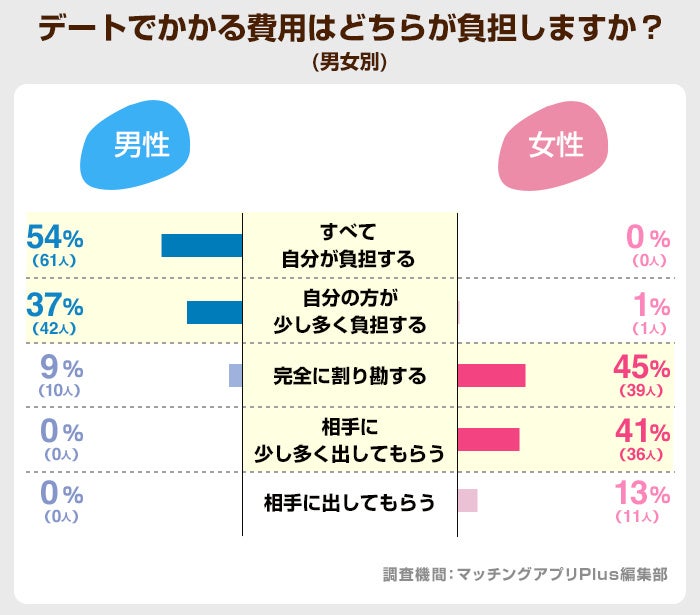 アンケート結果では「すべて自分が負担する」と回答した男性が5割を超えています。逆に女性側は「完全に割り勘する」か「相手に少し多く出してもらう」が最も多い結果でした。