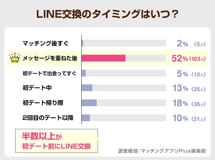 ペアーズのLINE交換のタイミングは「メッセージを重ねた後」が52%で半数以上の結果でした。