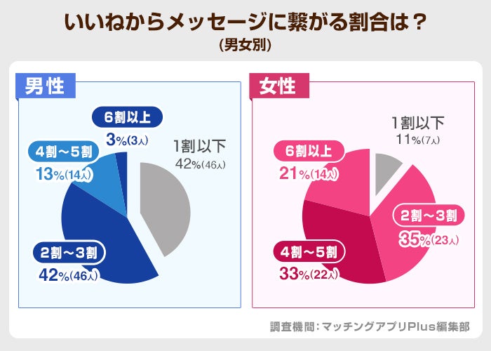 ペアーズでいいねを送って、メッセージまで繋がる割合のアンケートを集計した結果、男性の58%が2割以上メッセージに繋がると回答していました。