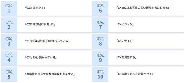 コンパクトにまとまった10のテーマを通して、CX変革のための知識を体系的に学ぶことができます。「CXとは何か?」から始まり、CXの目的や対象となる部門、顧客理解の方法や取り組みを定着させるためのポイントに至るまで、回を追うごとにCXにまつわる知識についての理解を深めていきます。