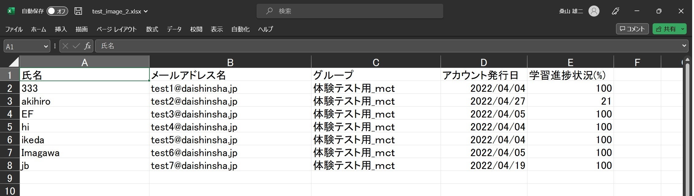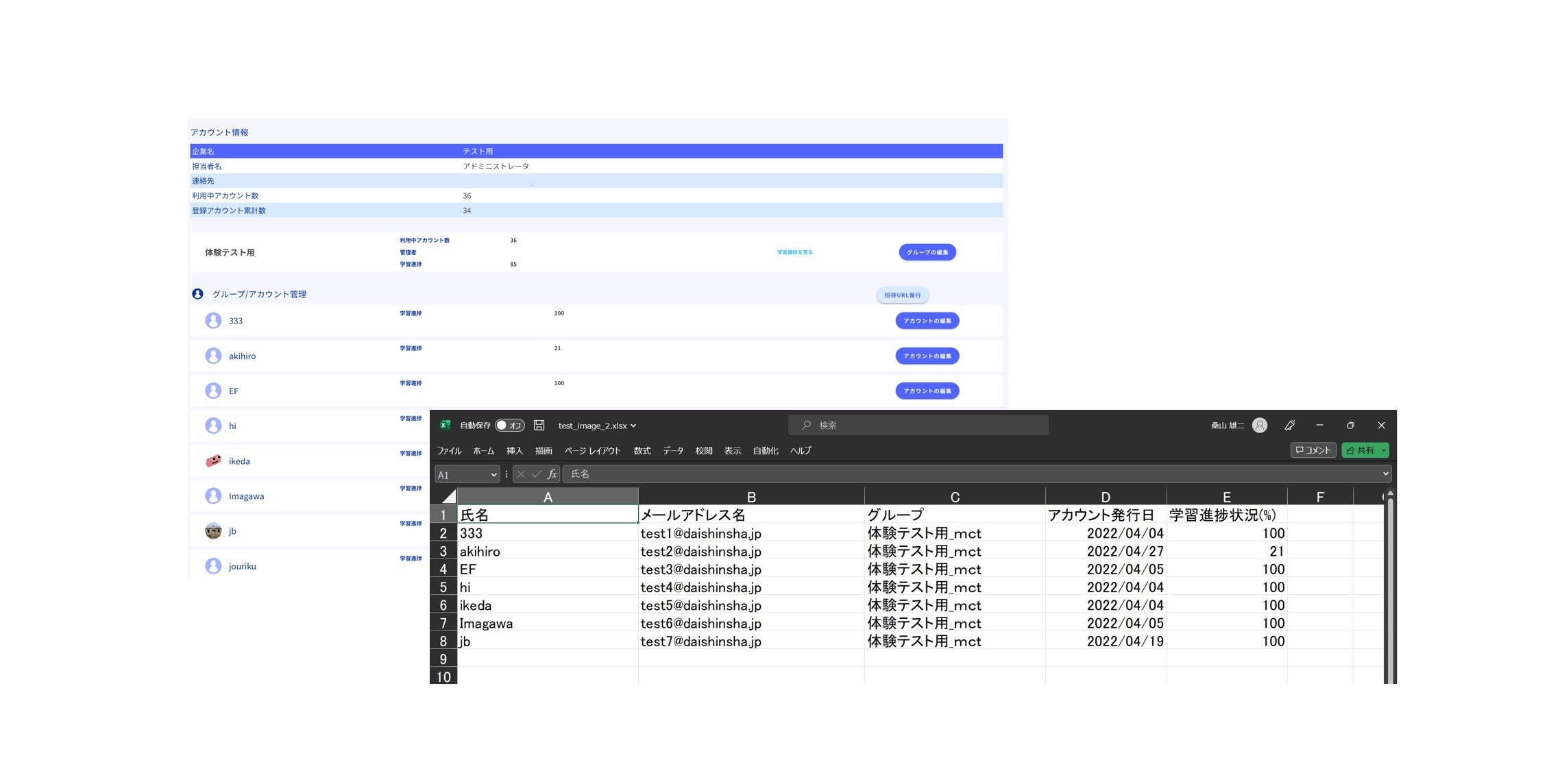 受講者一覧の情報をエクセル形式で出力、受講者の学習進捗の状況も数値で把握できるため、予め設定されたグループや、任意で設定された組織単位での進捗状況の確認や、対策検討の判断を行いやすいようになりました。