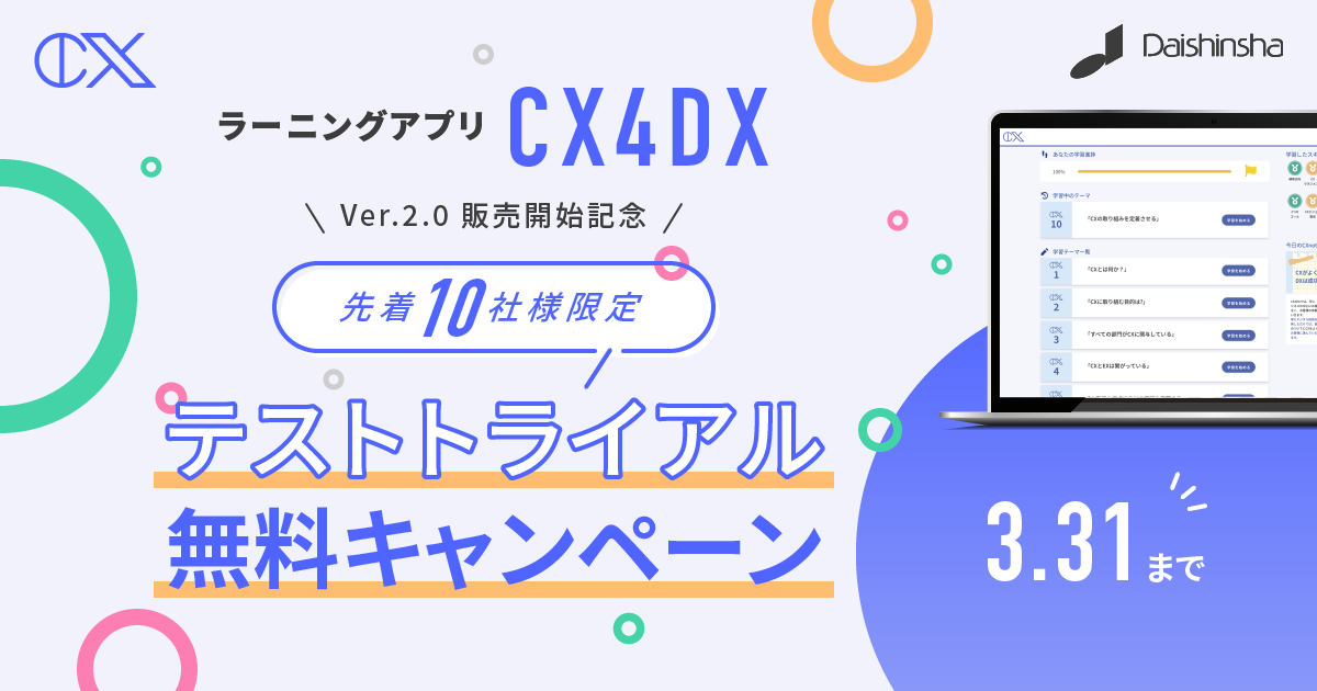 今回、こちらのプレスリリースの記念し、「【先着10社限定!】CX4DX無料お試しキャンペーン」を実施いたします。3月31日までにお申し込み頂きました企業様先着10社限定にて、無料トライアルアカウントを発行し、ご提供いたします。詳しくは以下までお問い合わせください。