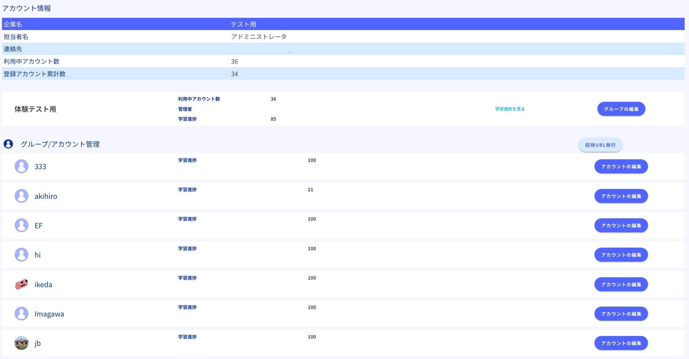 管理者アカウントの方は、受講者全体の学習進捗状況を管理画面から確認することができます。