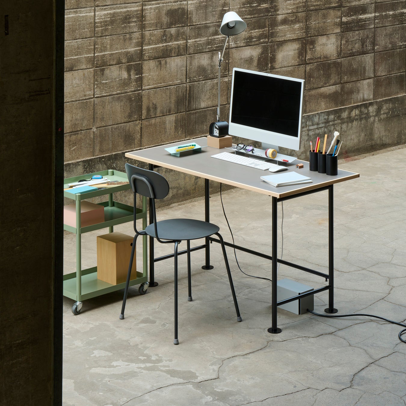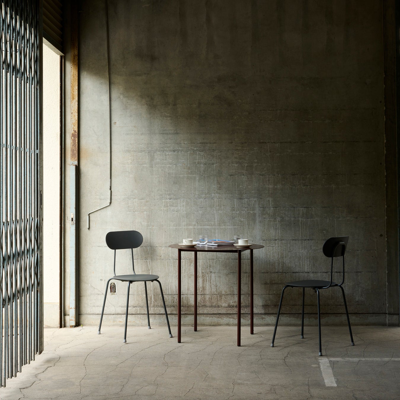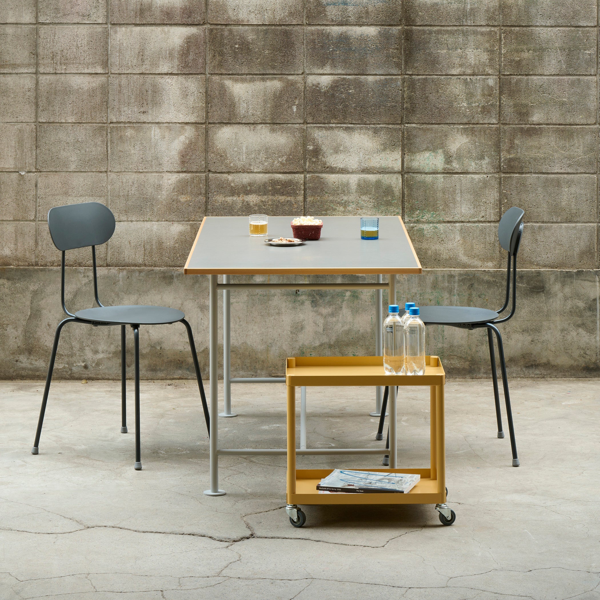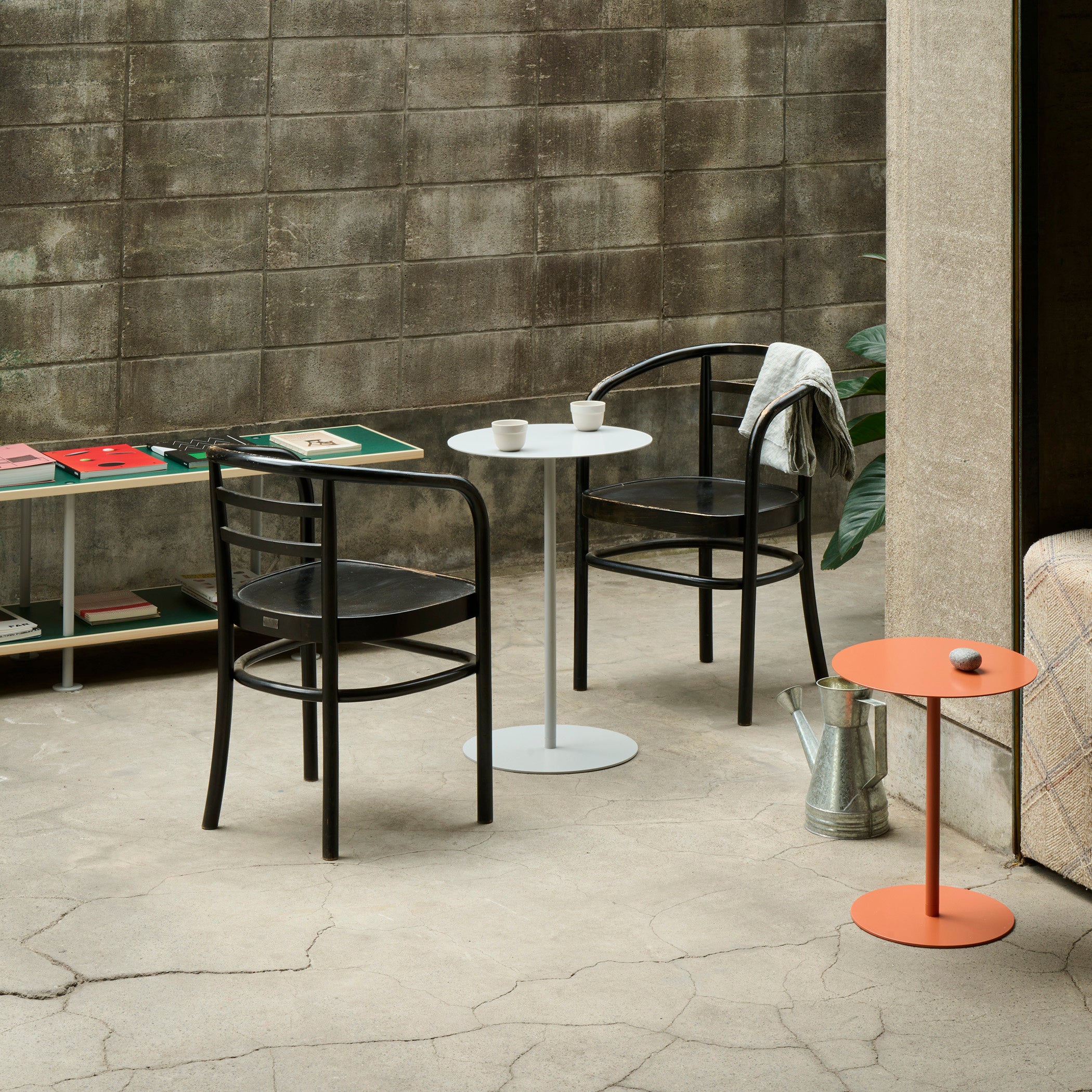 工具不要で組み立てが可能な、シンプルで薄い天板とスマートな4本脚のスチール製テーブル。スツールやコンパクトな椅子と組み合わせて、カフェやオフィス、ダイニングシーンまで幅広くご利用いただけます。