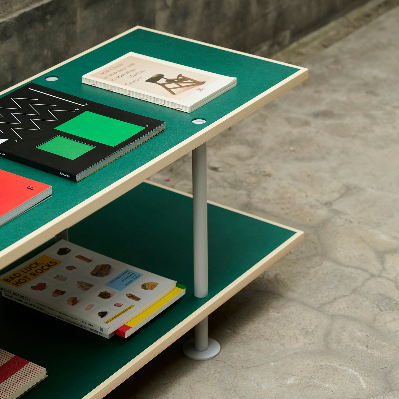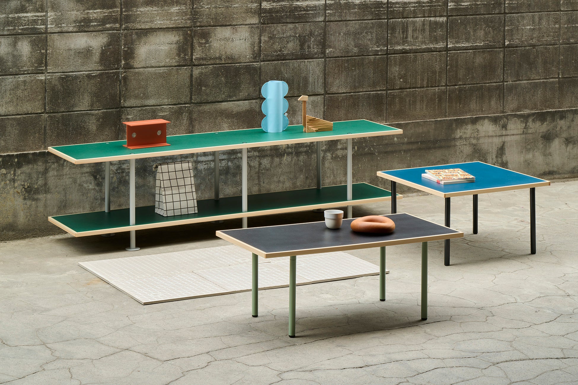 スチールパイプの組立式脚とカラフルなMDF、ヒノキを組み合わせた天板。シンプルながらも強度と軽量性を実現しています。軽量かつ強固なスチールパイプ脚と、床面を保護するワイドベースを備えています。組み立て簡単でフラットパック設計のため、常設利用だけでなくポップアップショップなどの仮設利用にも最適です。天板と脚の色を選べるカラーバリエーションがあります。