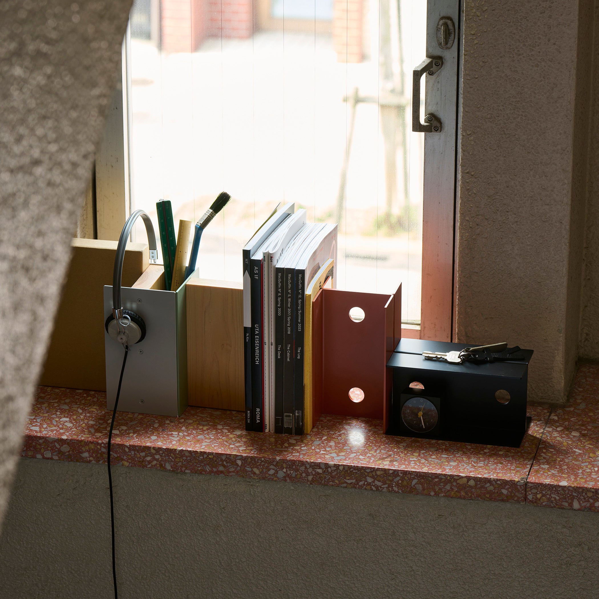 KIT のシンプルなジョイントで構成された組立式の家具は、 1 つの完成形であると同時に拡張性を備えた1 つのフォーマットでもあります。 環境や目的に合わせてアイテムを選べるだけではなく、発注時のサイズの調整や色の変更など、少量生産だからこそ対応できる仕組みを積極的に取り入れています。 KIT は、いまの時代に適したインダストリアルな家具開発に取り組んでいます。