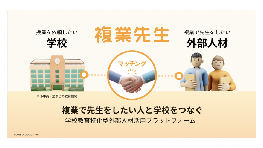 学校現場が、教育にかかわりたい多様な民間人材に授業をお願いできる外部人材活用サービスです。教員だけでは手が回りづらかったキャリア教育、探究学習・総合的な学習、プログラミング・グローバル・IT・起業教育・金融教育・性教育などの各領域において、民間人材の知見やネットワークを手軽に活用することができ、児童・生徒が社会とつながりながら学びを深める「社会に開かれた教育課程」を目指しています。(https://fukugyo-sensei.net/)