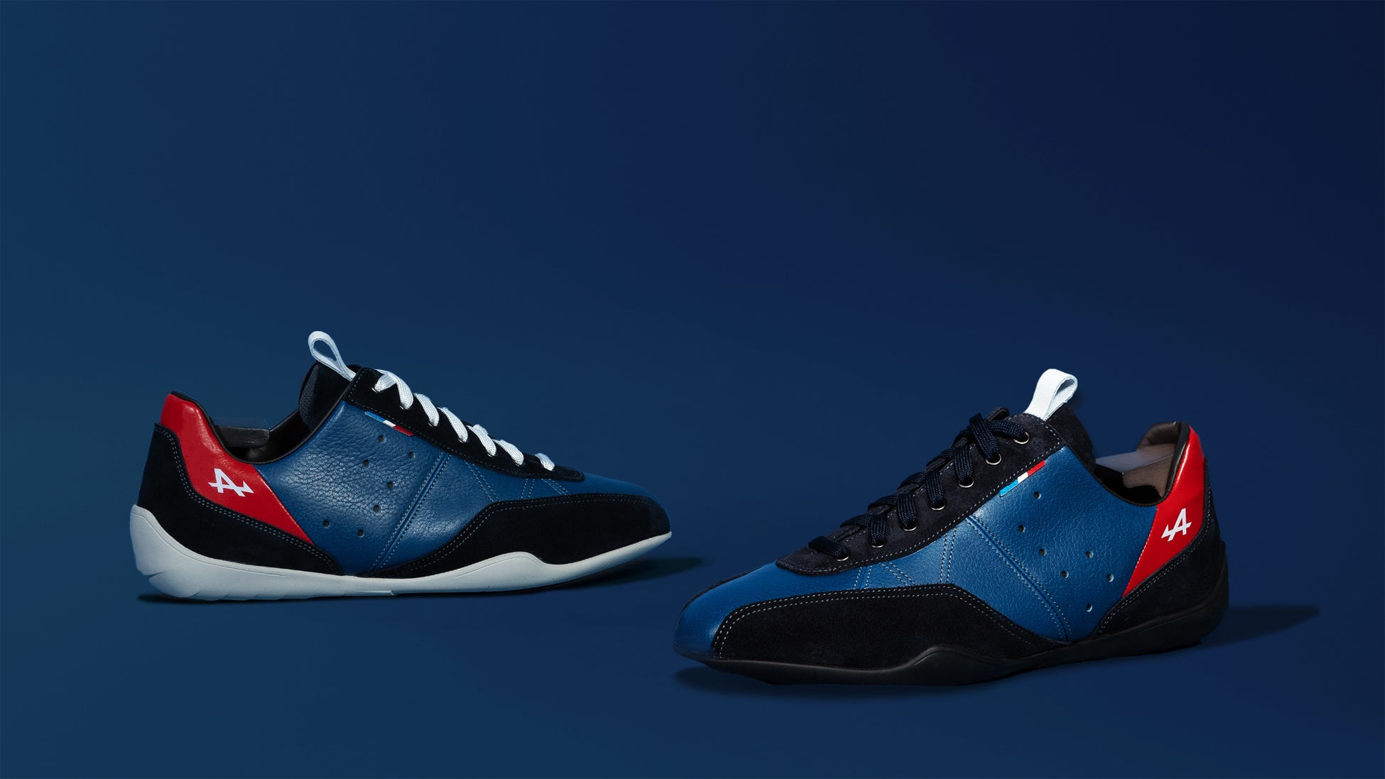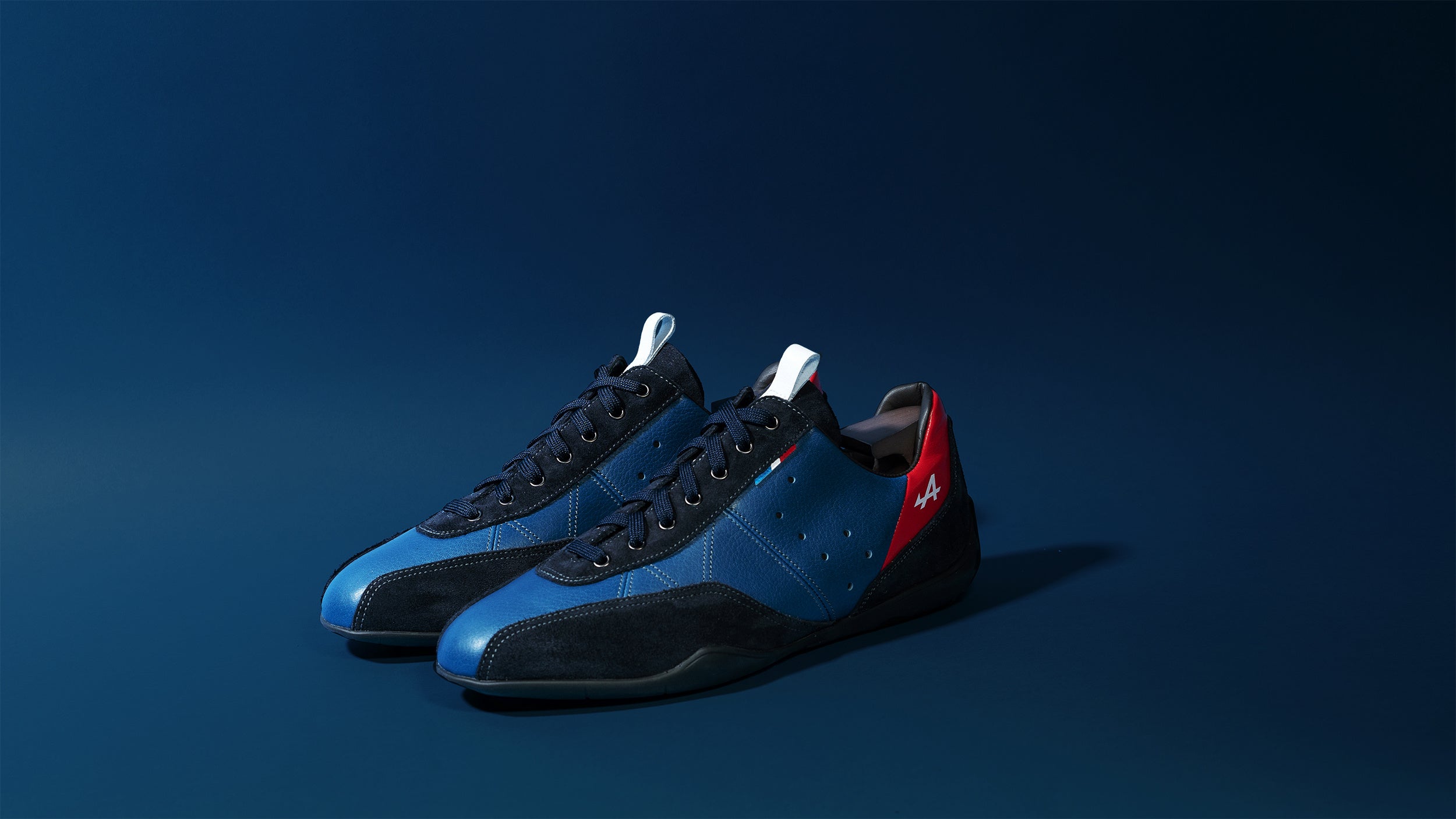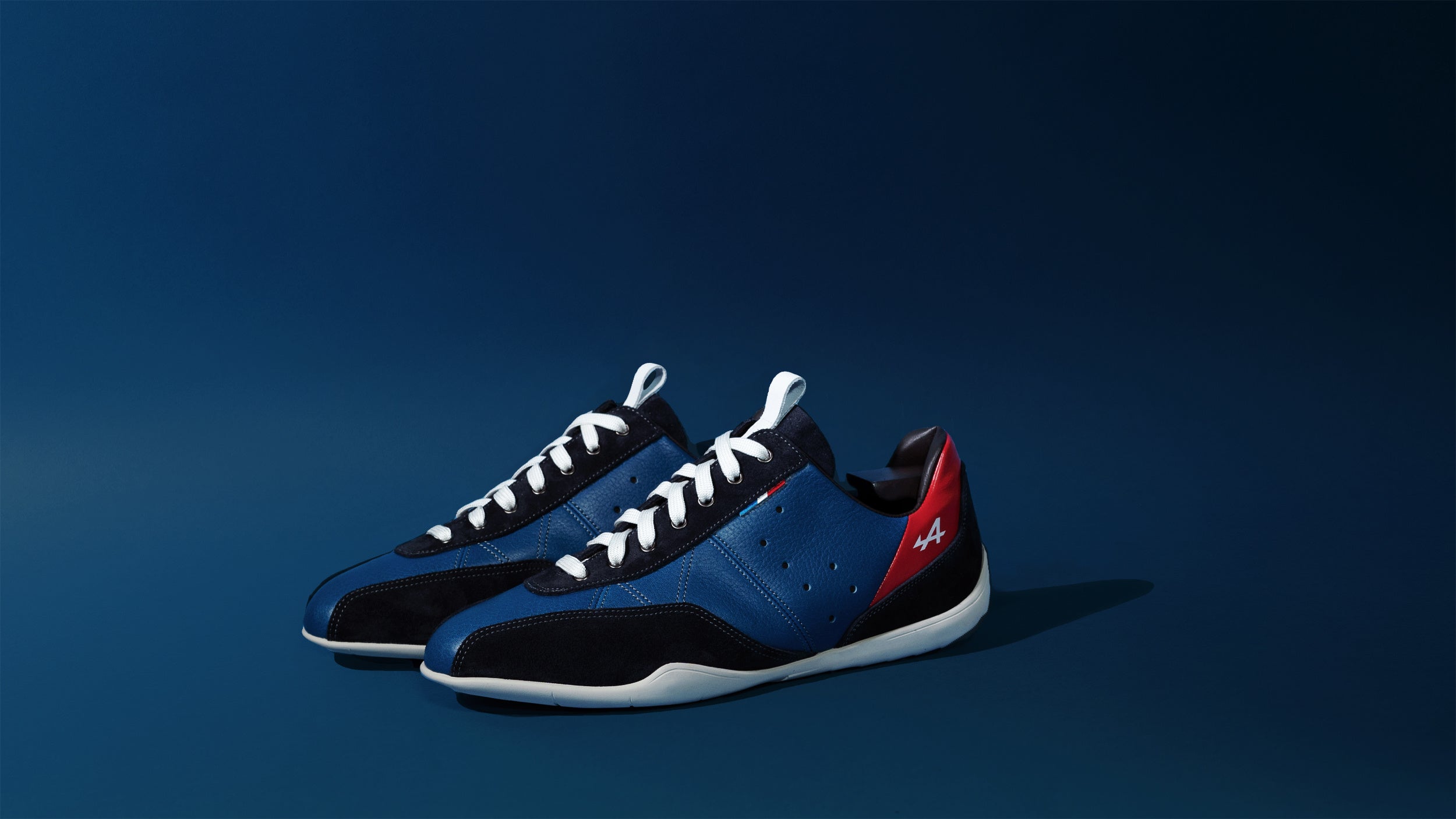 アッパーにはヒートプレス加工された艶のあるオリジナル ネグローニレザーと、ダークネイビーの頑丈なトスカーナスエードとのコンビネーション。槍の先端をモチーフにデザインされたフレンチレッドのカウンター トップの上には、アルピーヌのロゴをF1®やWEC®のデザインに倣って左右 シンメトリーに配置しています。アイレットのふちには、ハンドメイドで繊細にデザインされた独自のトリコロールフラッグをアイコニックにあいらい、バランス良く調和されたフレンチカラーチャートに よってスポーティかつ上品なスタイリングに仕上げられました。スポーツドライビングやグランドツーリングだけでなく、ライフスタイルの中で心地よく溶け込む滑らかな履き心地が楽しめます。