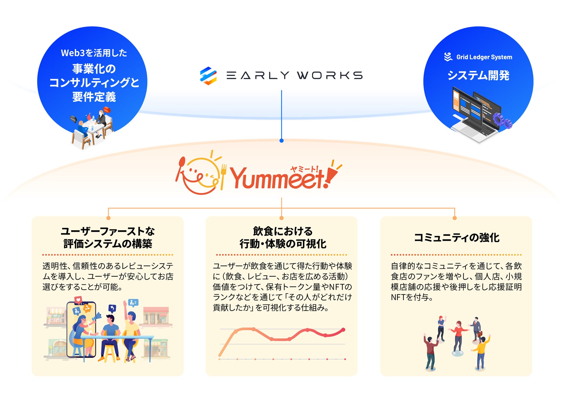 独自の高速ブロックチェーン技術 「GLS」を提供するアーリーワークス、グルメサイト「Yummeet!(ヤミート)」を運営するサービス・イノベーションと業務提携