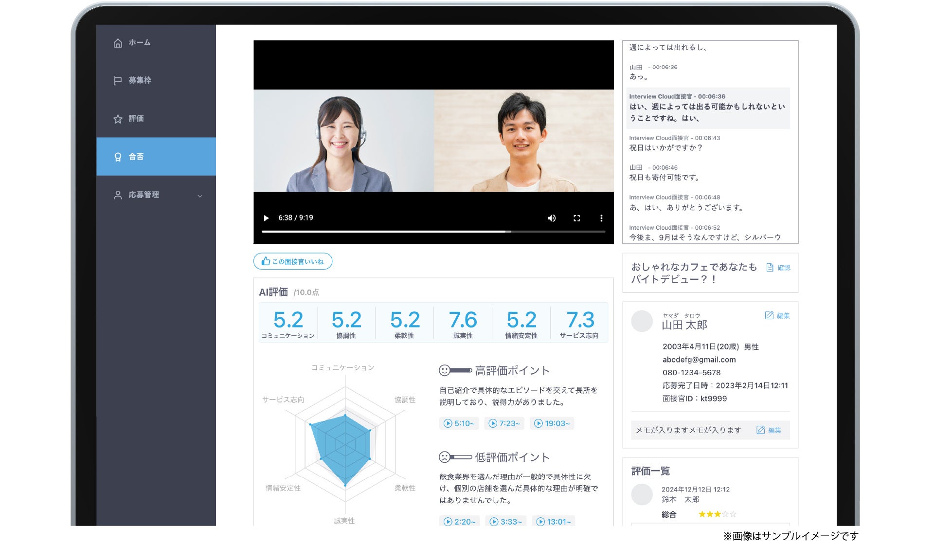 面接内容を解析し、応募者の性格要素に加え、これまで実施した面接データを基に独自に設定した評価項目をレーダーチャートとして表示し、これにより、応募者の各評価項目のスコアを一目で確認できるようになります。