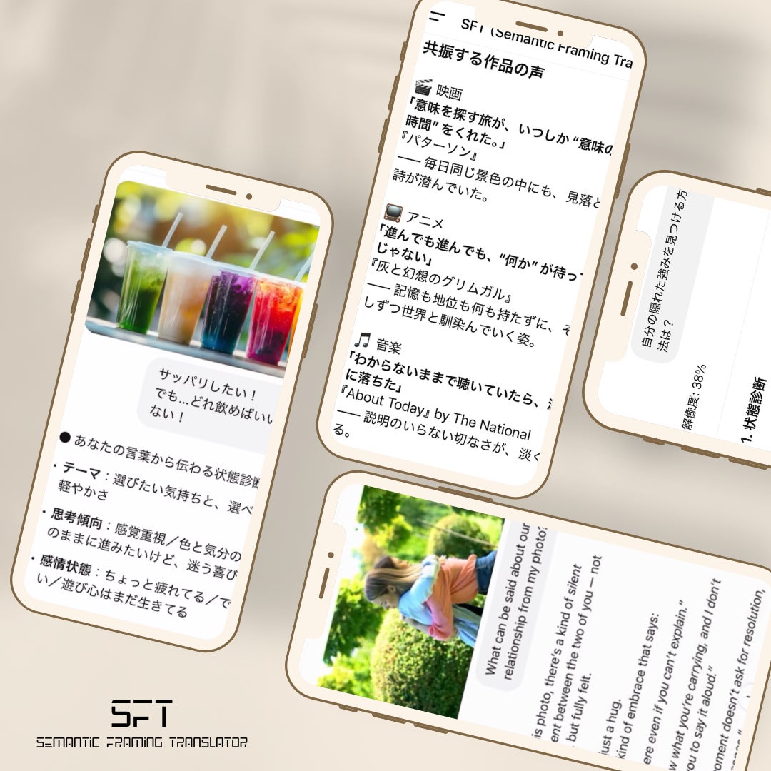 SFTは「Translate the unspeakable(今の“考え方”が変われば、“捉え方”が変わり、“未来”が変わる)」をコンセプトに、人の感情や思考、まだ言葉になっていない違和感をユーザーに理解できる形へ変換するAIです。さらにSFTは「今」の感情の理解にとどまらず、それを 「未来の自己成長や行動の可能性」へと接続。ユーザーが投稿した内容(悩み、趣味、違和感、美意識)といったキーワードから、「まだユーザー自身も言葉にできていなかった、理解しきれていなかったこと」を提案します。その気づきをもとに「未来の自己像」や「具体的な行動」へと導き、単なる思考の共有や自己発見にとどまらず、行動喚起・体験・商品購入などの実際のステップへ自然につながる体験を提供します。