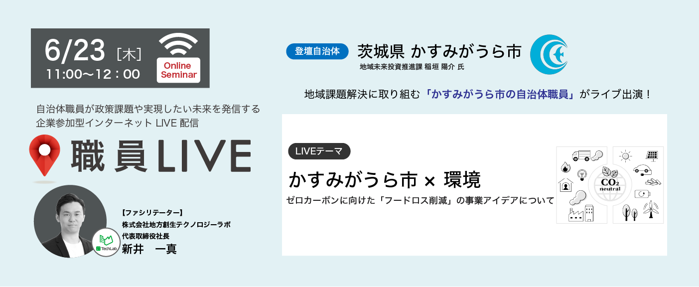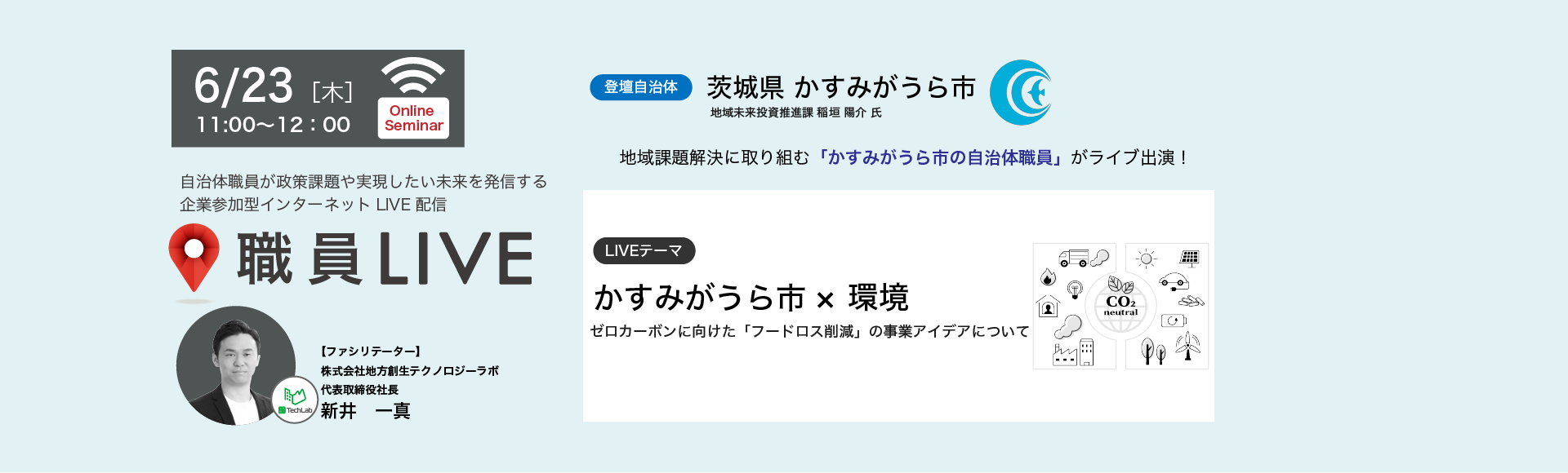 そこで、地方創生テクノロジーラボでは、実際の現場で官民連携事業に携わる自治体職員が、地域の抱える課題や要望を民間企業に直接伝える場として、「職員LIVE」を開催いたします。