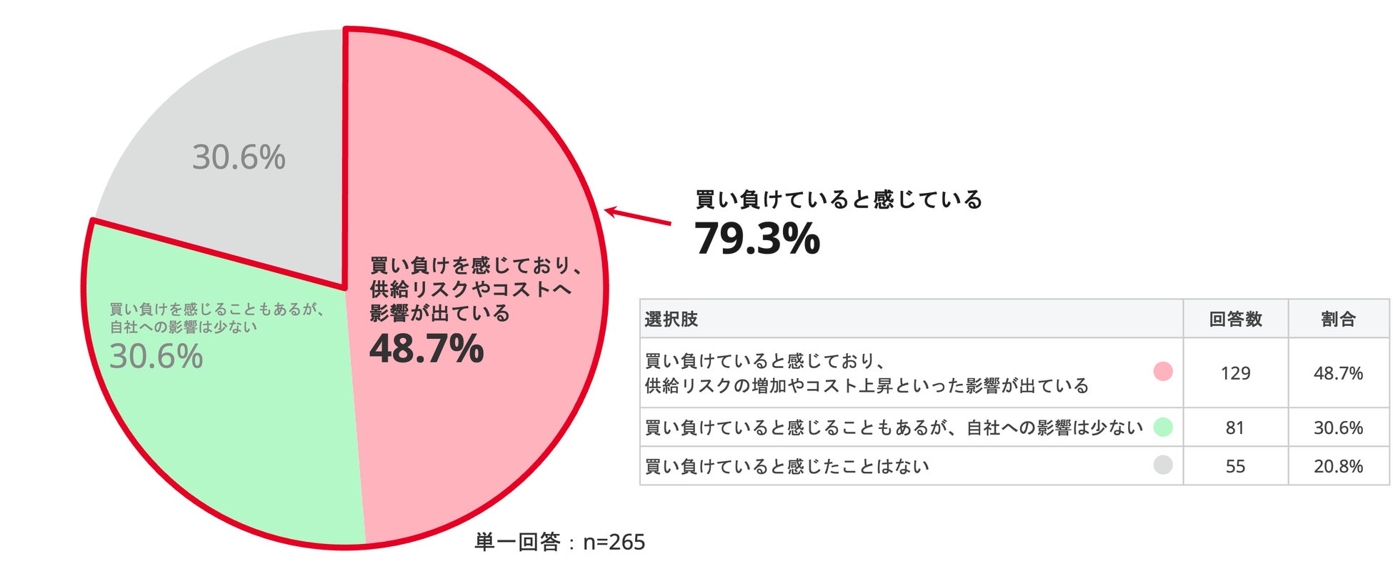 さらに、約8割の調達担当者が「買い負け」を実感しており、その半数が供給リスクやコスト増加の影響を受けていると回答しています。