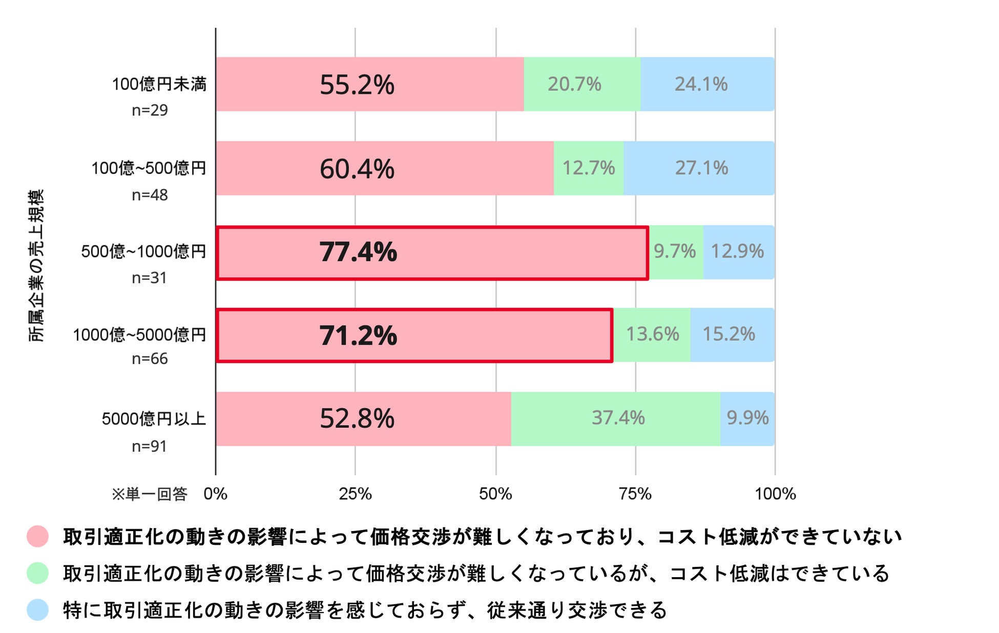 企業規模別に見ると、売上500億~5000億円規模の企業では、7割以上が取引適正化によりコスト低減が難しいと回答しています。