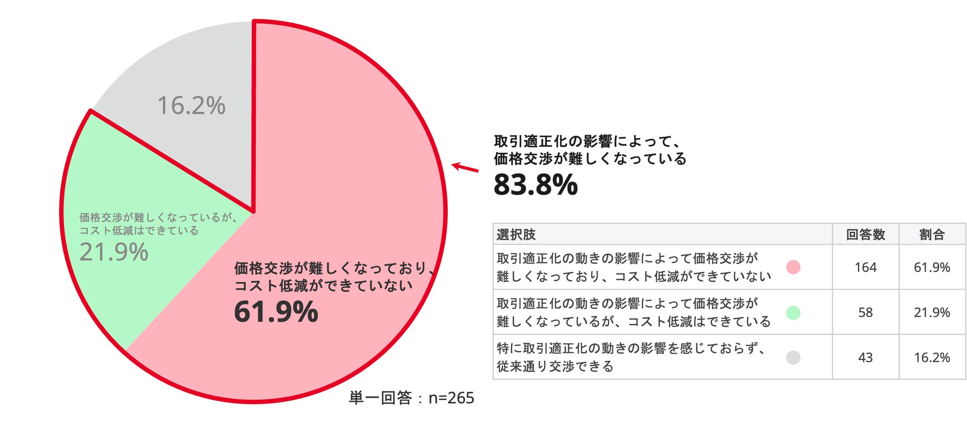 回答者の約8割が取引適正化の影響によって価格交渉が難化と回答。さらに約6割が価格交渉の難化に伴い、コスト低減ができていないと回答している。
