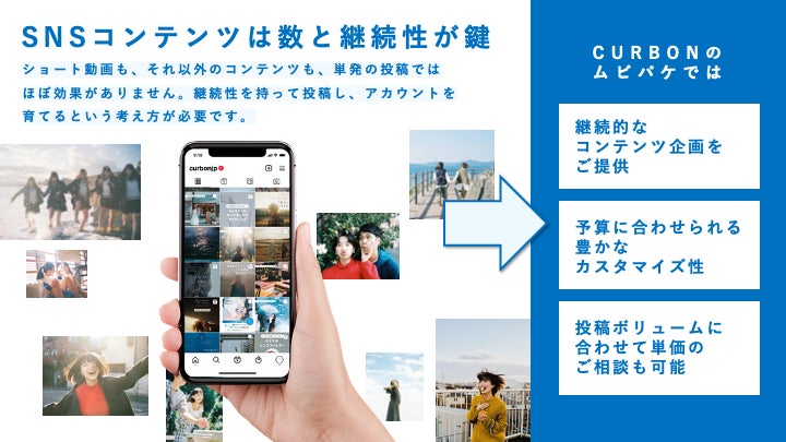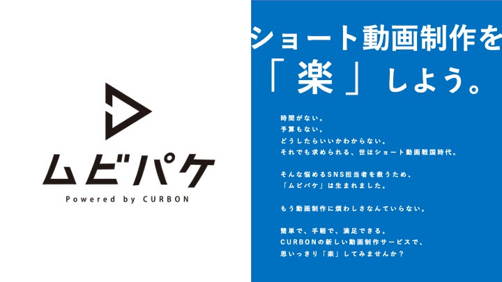 SNSにおけるショート動画の需要の高まりを受け、株式会社CURBON(代表取締役:武井宏員、本社:東京都世田谷区、以下「CURBON」)は、ショート動画制作を手軽に簡単に発注できるようパッケージ化した新たなサービス「ムビパケ」を開始します。