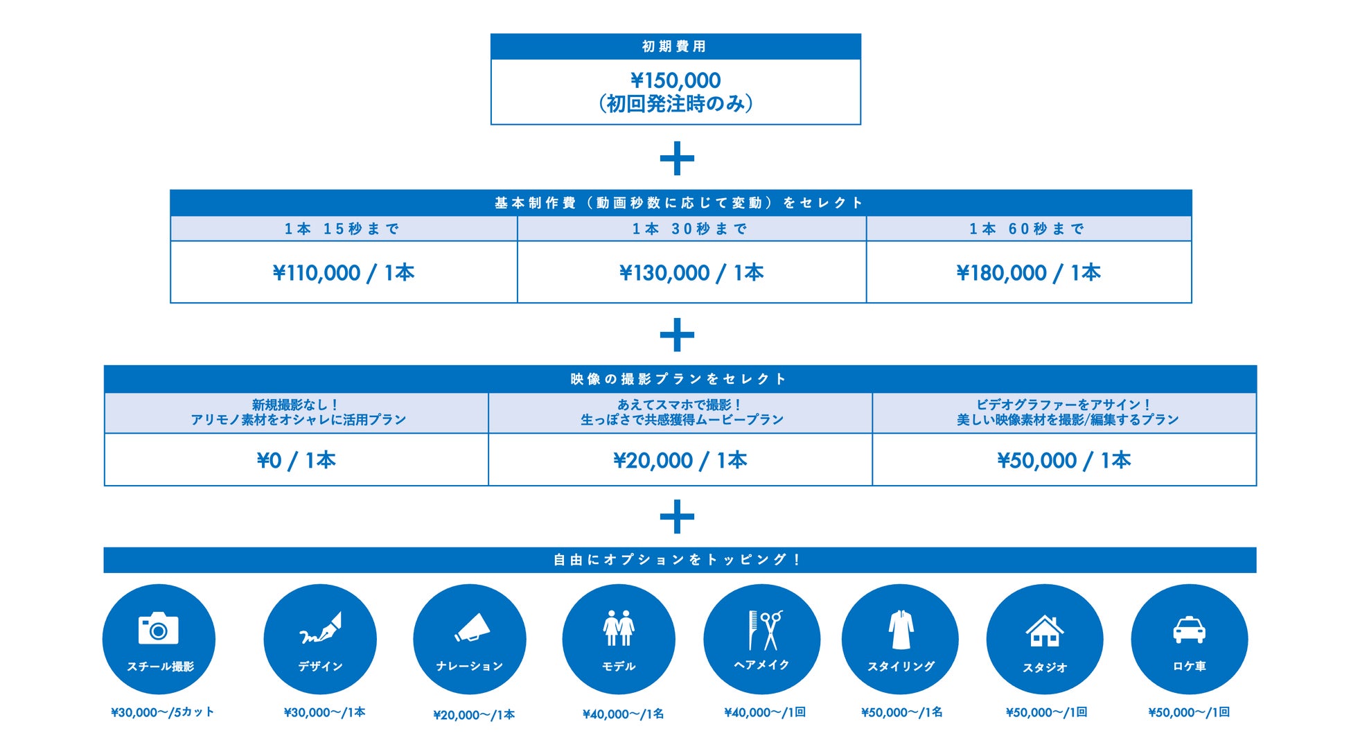 「ムビパケ」では、掛かる費用をわかりやすく、計算しやすいフローチャート化しました。継続性が鍵となるSNSコンテンツに合わせて、5本〜のお引き受けとすることでボリュームディスカウントを予め適用。単発のお引き受けよりも、お得な価格となっています。