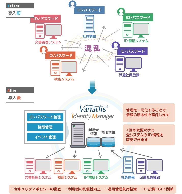 この度の「VANADIS」導入にあたっては、大規模組織への導入で培われたベストプラクティスを取り入れつつ、三菱重工業の独自性を反映させたシステム構築を行います。これにより、IDにおける規制と業務要件とのバランスをとりつつ、将来のクラウド化や認証技術の進化に対応することができます。