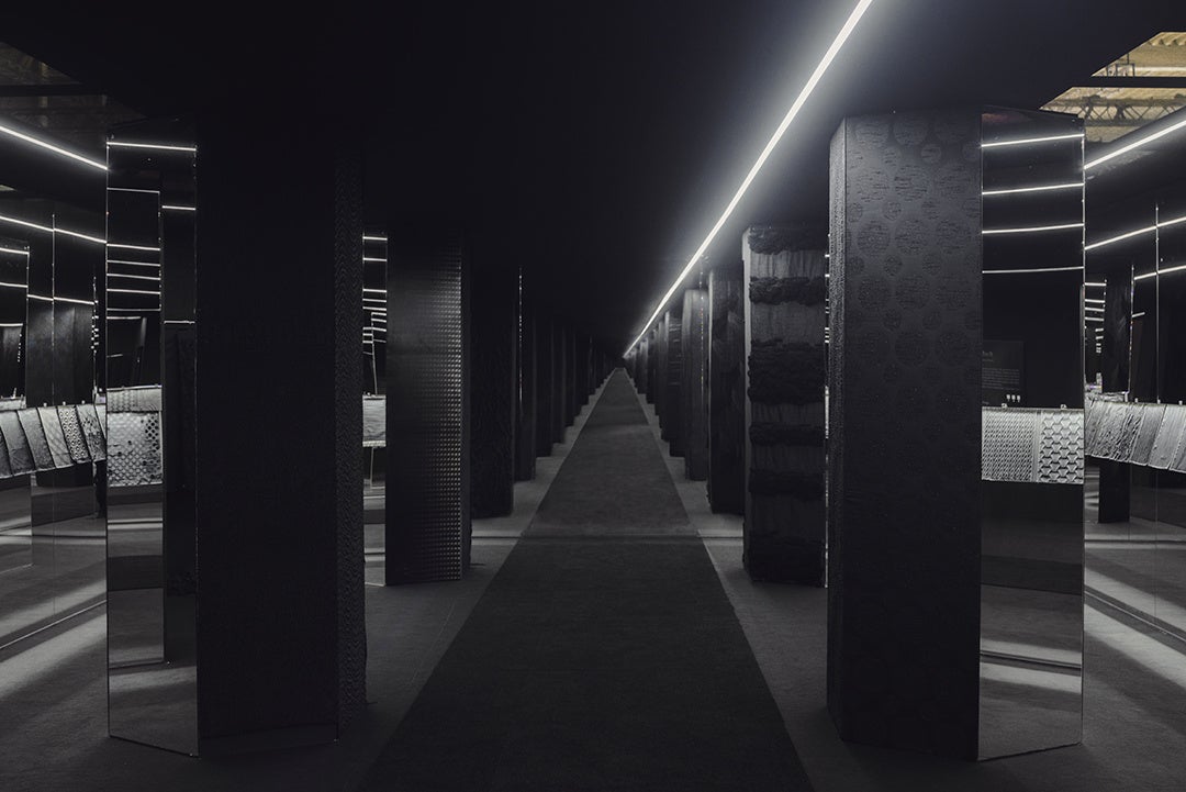 会場では、堆積・圧縮・隆起といった地層形成のプロセスを手掛かりに、織の技法が生み出す多様な質感を空間の中で紹介します。照明デザイナー・岡安 泉氏のディレクションのもと、光や距離によって変化するテキスタイルの表情を、視覚と触感の両面から読み取れる展示としました。