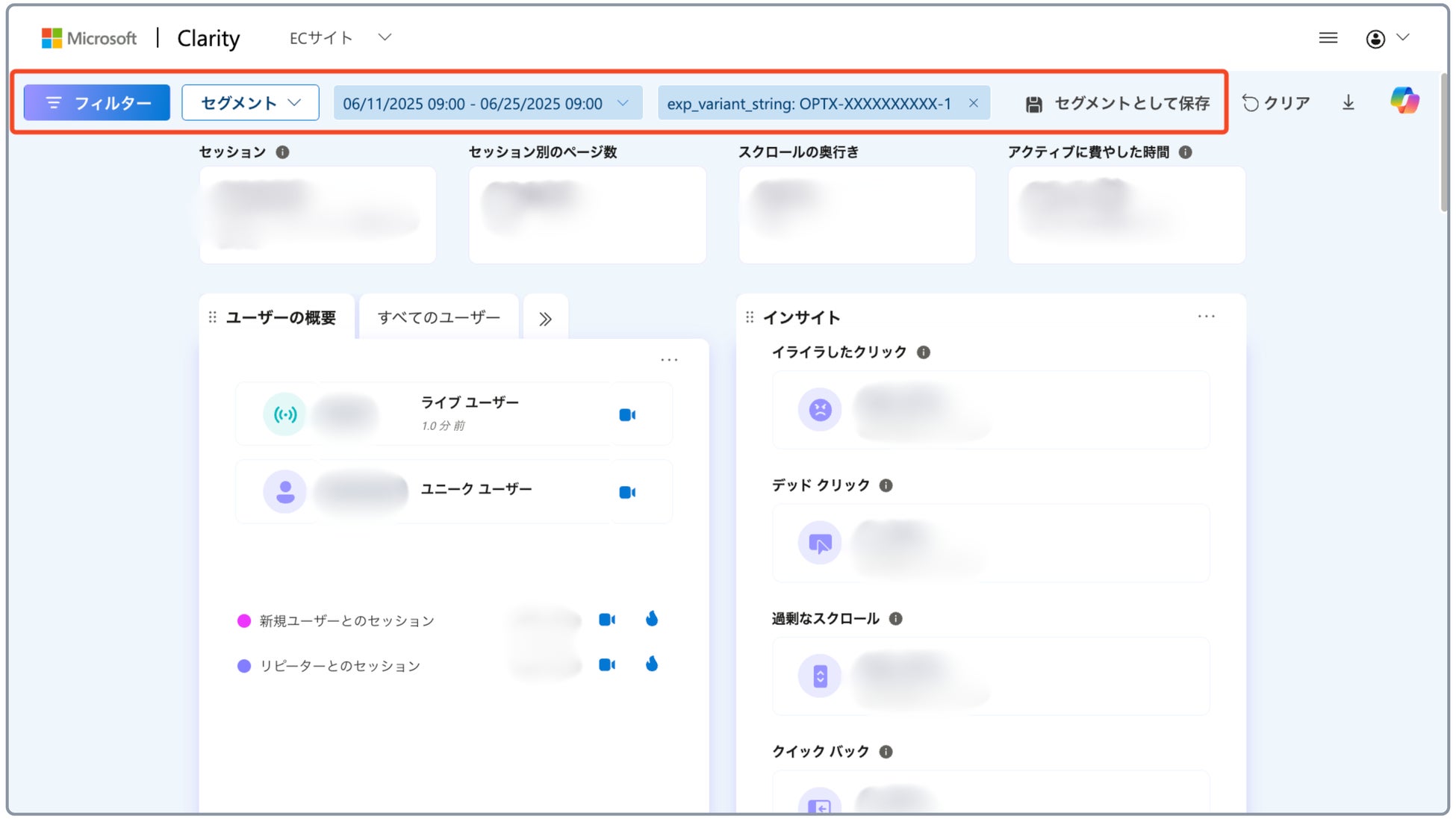 この「テストパターンID」をもとに Clarity 上でフィルターを適用することで、特定のテストパターンに割り当てられたユーザーだけを対象として分析することができます。