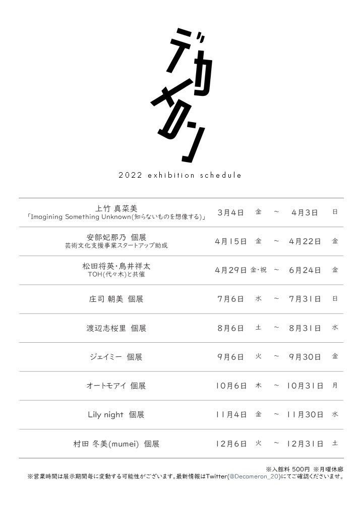 デカメロンは2020年7月コロナ禍の新宿歌舞伎町にオープンしたアートスペースです。21年5月、展示面積を増床。キュレーターを務める黒瀧紀代士が新宿歌舞伎町で作品展示を行う意義を作家と共に議論しながら展示を行って参りました。