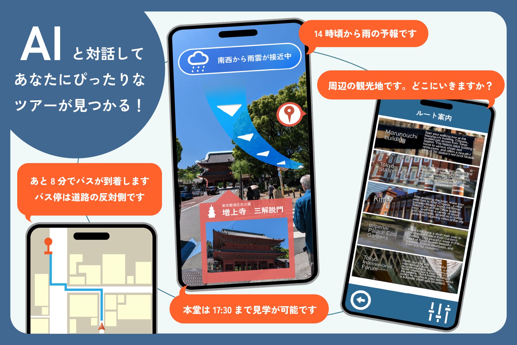- 専門ガイドによる案内をAIの音声案内に組み込み、観光ガイドと共に行くARツアー