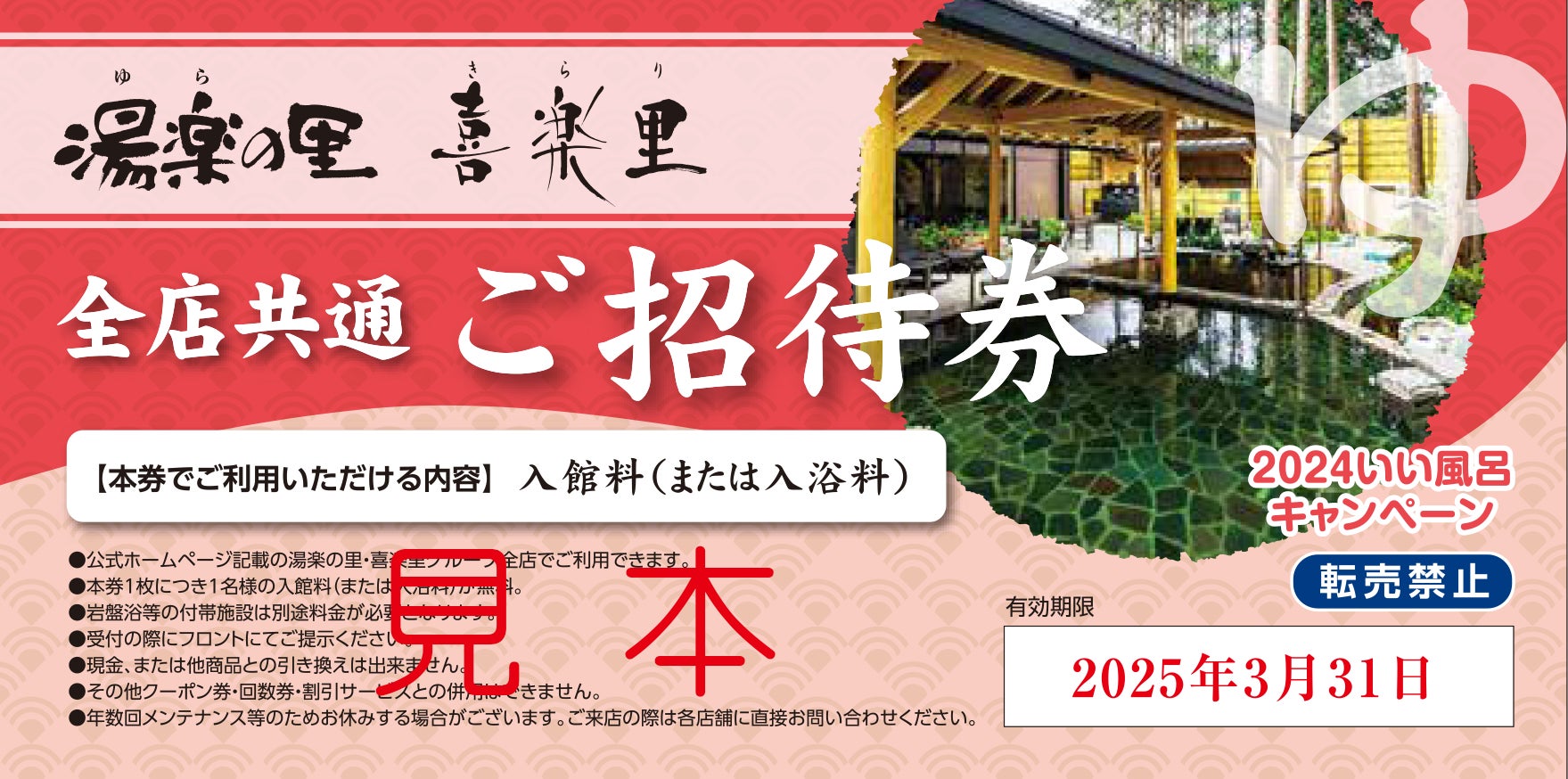 入館回数券10回分(11,500円)を購入につき、湯楽の里・喜楽里全店で使える共通招待券を1枚プレゼント