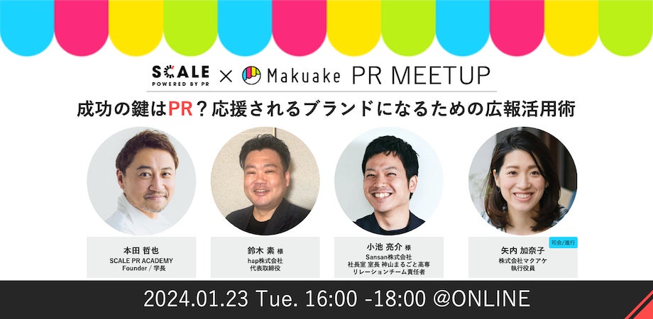 また、今回の業務提携をきっかけとした取り組みとして、Makuake実行者のためのPR勉強会特別版「Makuake × SCALE PR MEETUP」を2024年1月23日(火)に開催します。
