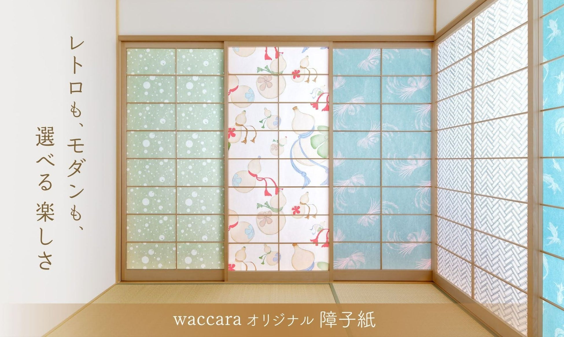 waccaraでは、ふすま紙をはじめ、障子紙や手軽に貼れるふすまリメイクシートなど、和室を彩るアイテムも取り揃えています。