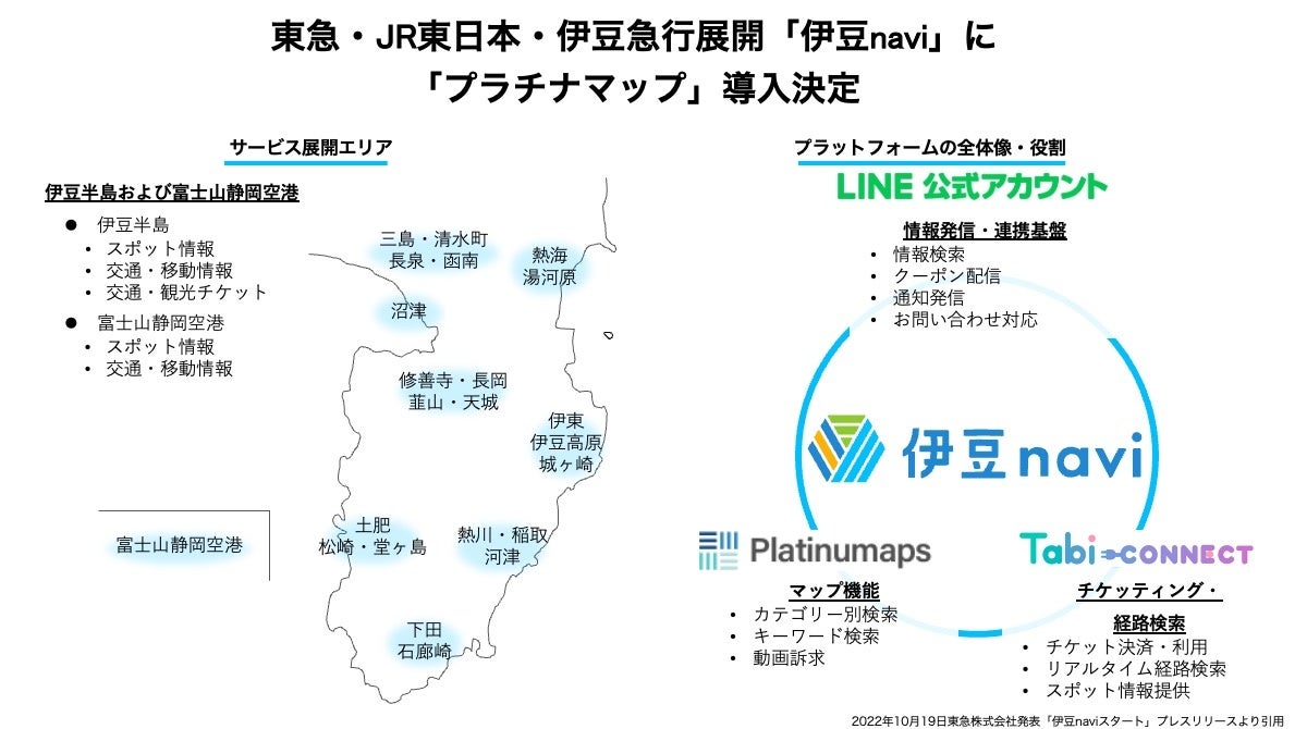 ボールドライト株式会社(本社:東京都新宿区、代表取締役社長:宮本章弘、以下:ボールドライト)が開発する観光DXプラットフォーム「プラチナマップ」が、2022年11月1日(火)より東急株式会社、東日本旅客鉄道株式会社、伊豆急行株式会社(以下:同3社)が伊豆地域の活性化・来訪促進を目的に提供するデジタルサービス「伊豆navi」に導入されました。「伊豆navi」は同3社が2019年から実施した観光型MaaS「Izuko」の実証実験で得た知見を踏まえて提供開始される新サービスです。