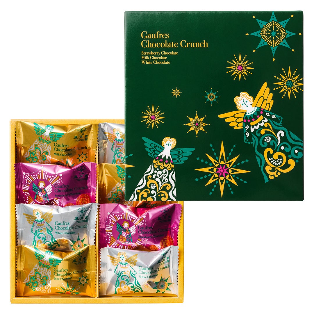 商品特長:3種類の味の『ゴーフル チョコレートクランチ』を、天使をあしらった限定デザインの箱に詰め合わせました。3種の色とりどりの個包装も華やかです。