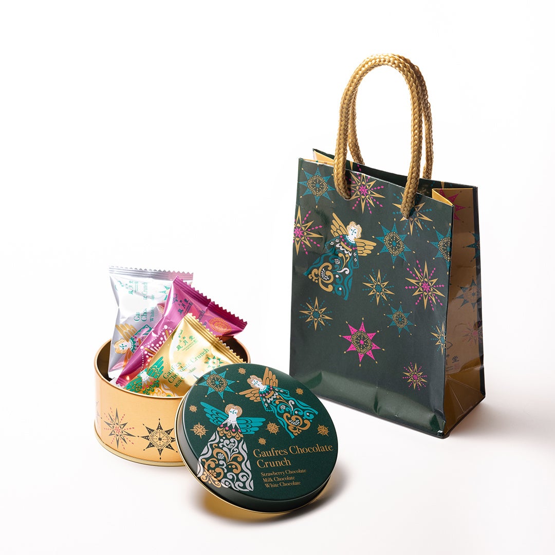 商品特長:3種類の味の『ゴーフル チョコレートクランチ』を、天使をあしらった限定デザインのミニ缶に詰め合わせました。可愛いミニ手提げに入った限定缶は、季節の贈り物にお薦めです。