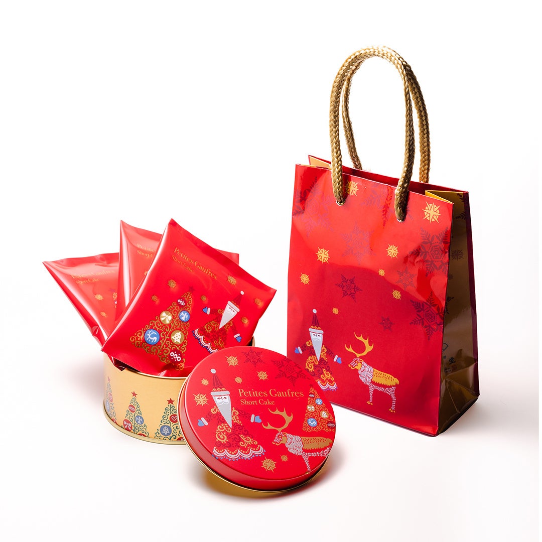 商品特長:クリスマス限定の『プティゴーフル ショートケーキ味』を、サンタクロースやトナカイをあしらった限定デザインのミニ缶に詰め合わせました。可愛いミニ手提げに入った限定缶は季節の贈り物にお薦めです。
