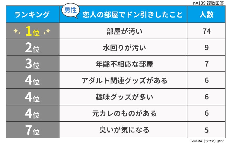 男性139人に「彼女の部屋でドン引きしたこと」を聞いたところ、回答は以下のようになりました。