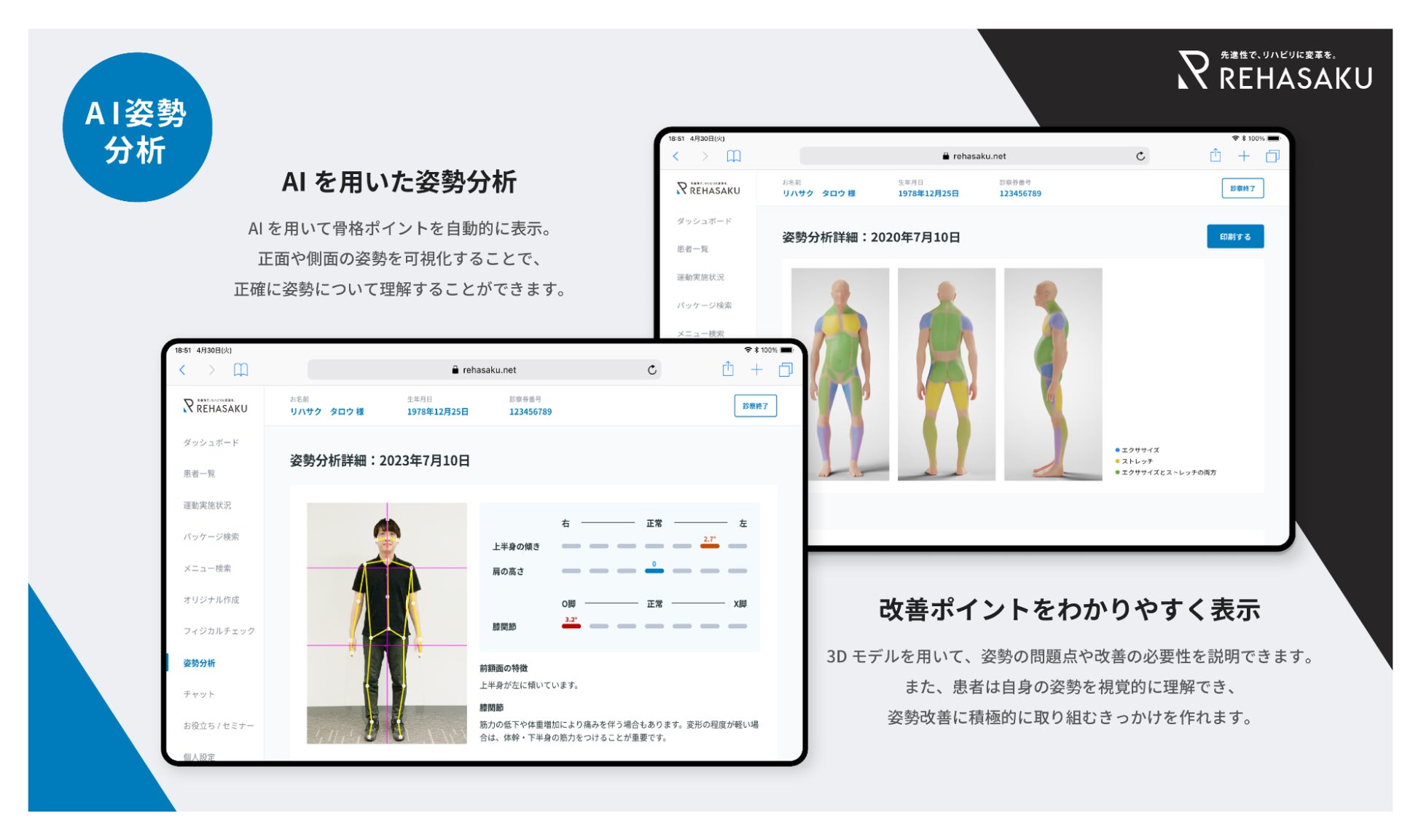 また、今後は患者さんの身体評価を総合的にサポートすることで、セラピストがより適切な施術を提供できるようサービスを拡充していきます。その皮切りとして、この度、当社では「AI姿勢分析」の機能をローンチし、患者さんの不良姿勢からくる痛みに対して、セラピストが適切なアプローチをできるようサポートして参ります。