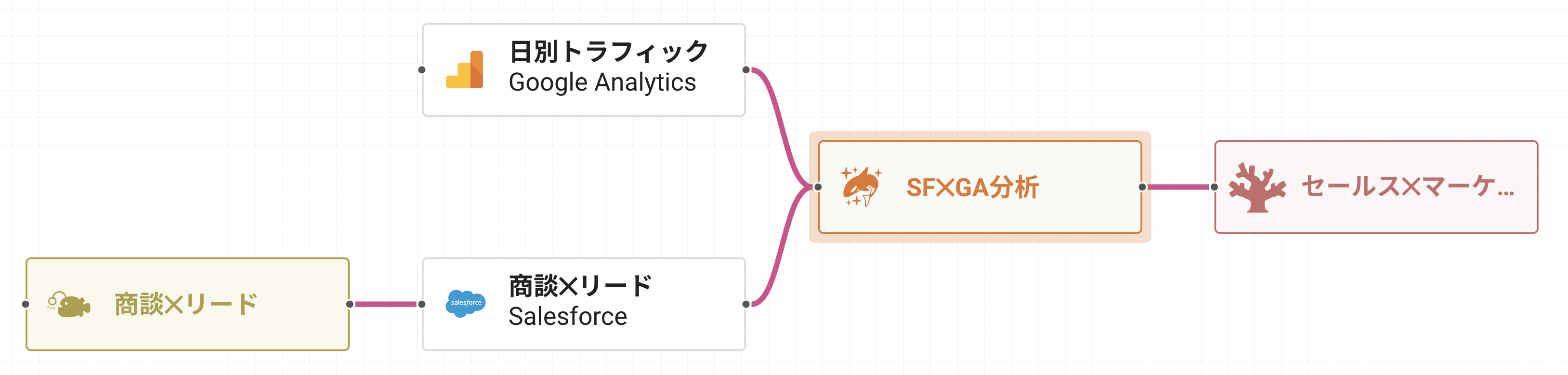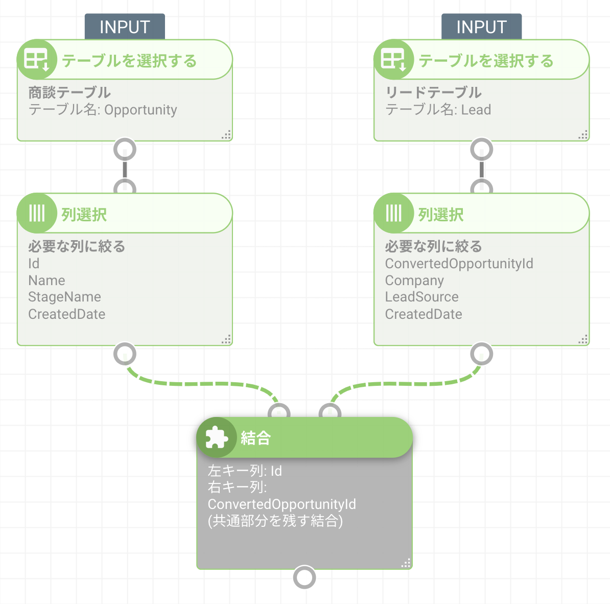 例えば、"商談"と"リード"を結合したデータを作成するイメージは下記の通り。