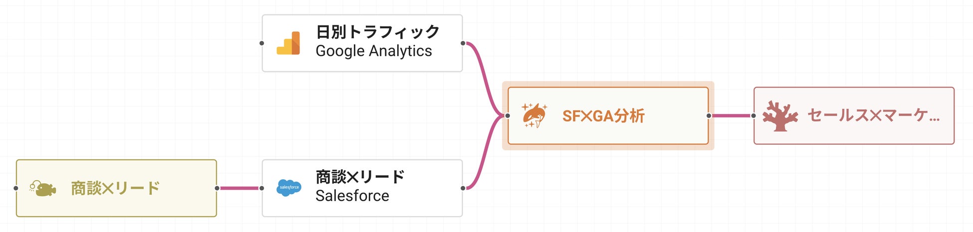 連携したセールスフォースのデータは、例えばGoogle Analytics(※2)のデータと結合し、マーケティング施策の検証に役立てられます。
