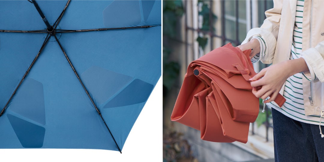 生地にシェイプメモリーを搭載と、ワンアクションで開閉できる自動開閉で「たたみにくい」を解消。